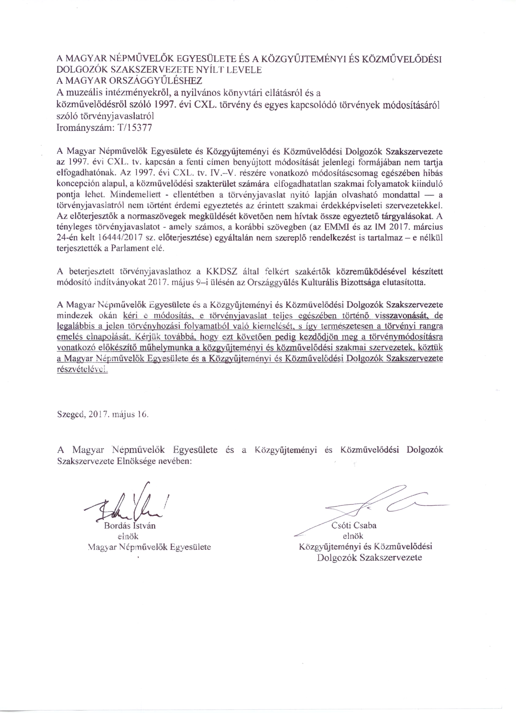 Mellékelten megküldöm a Közgyűjteményi és Közművelődési Dolgozók Szakszervezetének (KKDSZ) és a Magyar Népművelők Egyesületének (MNE) közösen kiadott nyílt levelét az 1997. évi CXL tv. módosításával kapcsolatban.