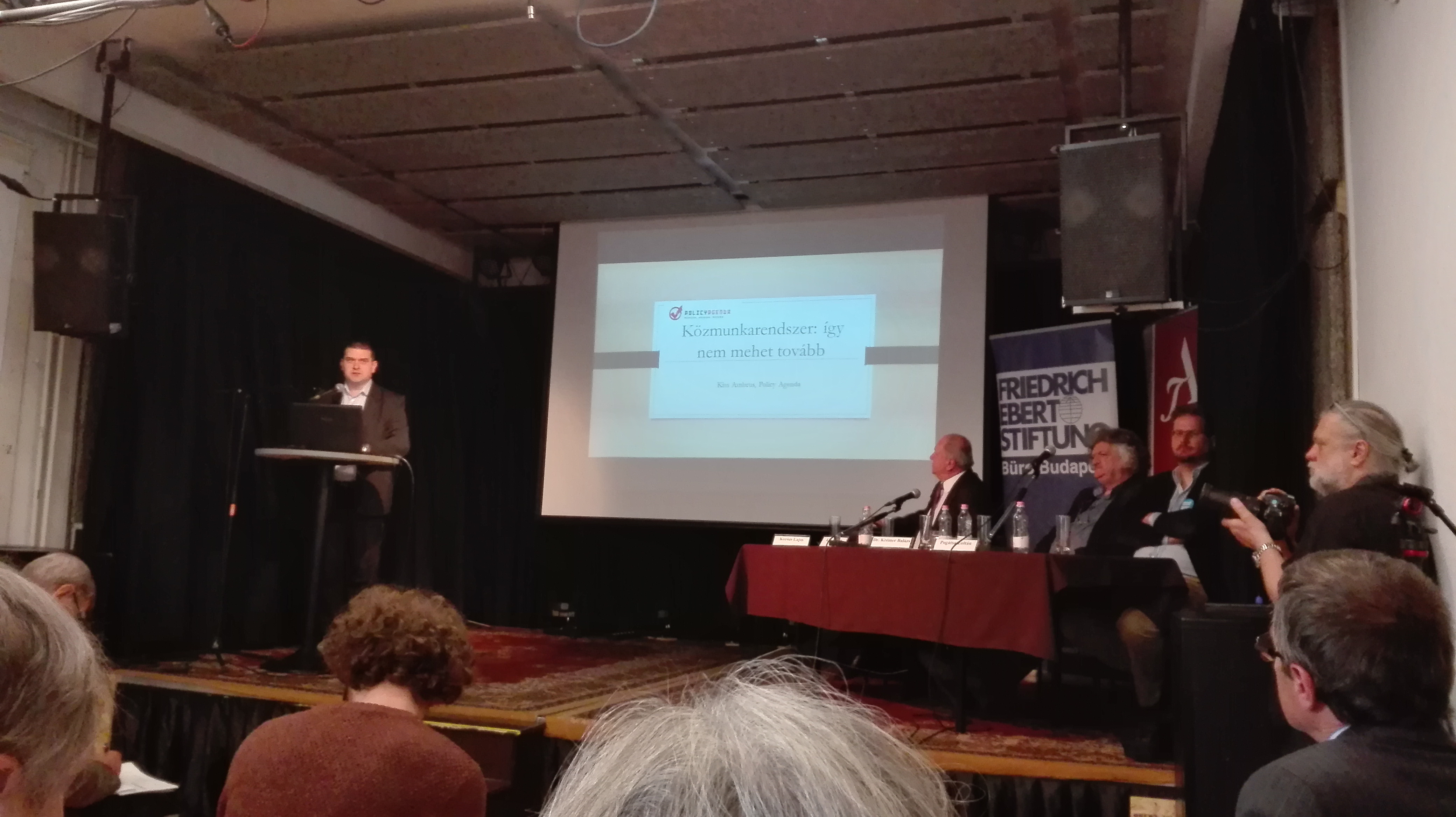 A délelőtti blokk utolsó szereplője Kiss Ambrus volt. A Policy Agendát képviselő előadó a mega-közmunkarendszerről beszélt, ami kis-gömböc módjára dagad. 2013-ban még 50 000 dolgoztak ebben a formában, mára több mint 300 000 embert érint.