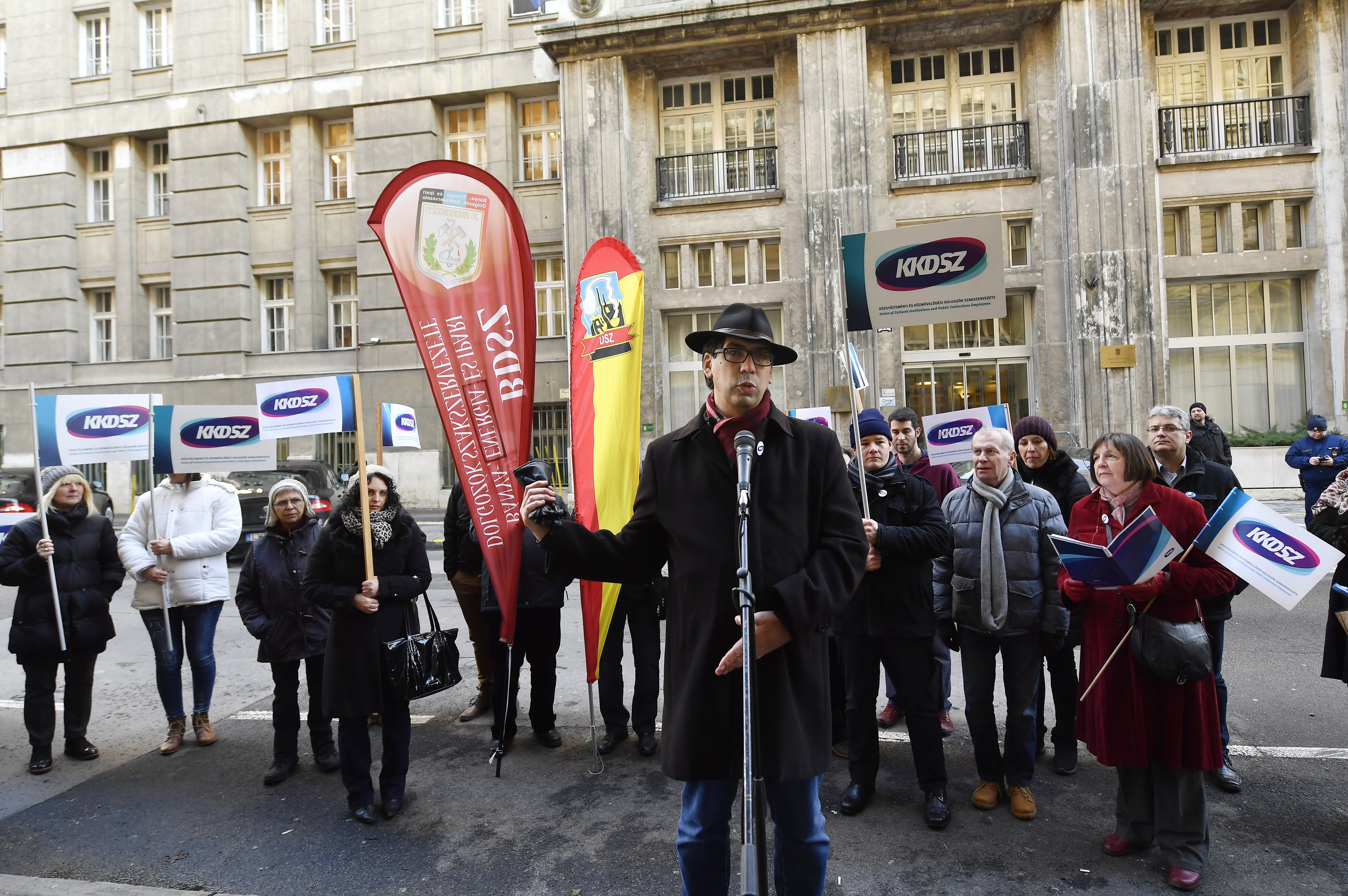 Csóti Csaba, a Közgyûjteményi és Közmûvelõdési Dolgozók Szakszervezetének (KKDSZ) elnöke sajtótájékoztatót tart az Emberi Erõforrások Minisztériumának Kultúráért Felelõs Államtitkársága elõtt, mielõtt petíciót adott át 2018. január 22-én. A dolgozók által aláírt petíció a KKDSZ-szel történõ bértárgyalás megkezdését követeli.